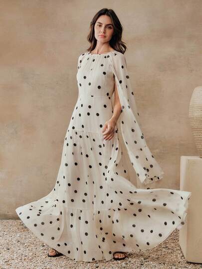 Anewsta Women's Long Polka Dot Flared Hem Dress, Versatile & Elegant Cocktail Gown - Beige - View 1