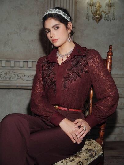 Anewsta Women's New Lace Burgundy Angora Embroidered Beaded Long Sleeve Elegant Blouse, European And American Street Style - Burgundy - View 1