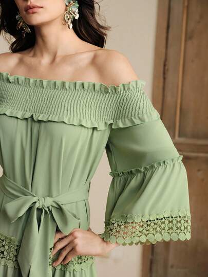 Anewsta Women's Off-Shoulder Floral Embroidered Waist Elegant Dress - Green - View 1