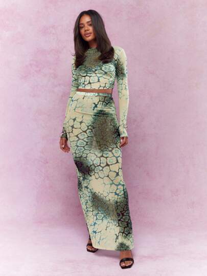 MISSGUIDED Animal Print Sheer Mesh Side Ruched Long Sleeves Crop Top And Flare Hem Maxi Skirt Two Piece Co-Ord Set - Multicolor - View 1