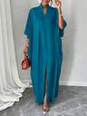 Elegant Blue V Neck Batwing Sleeve Maxi Dress Three Quarter Length Flowy Caftan Look Arabian Split Thigh Dress