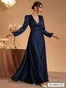 Elegant Blue V Neck Batwing Sleeve Maxi Dress Three Quarter Length Flowy Caftan Look Arabian Split Thigh Dress