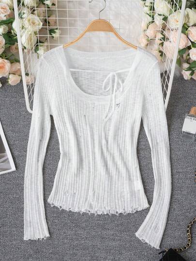 Apricot Oversized Crew Neck Slim Fit Ripped Knitted Top With Shoulder Cut-Outs, Tie Bow Design, Long Sleeve Cover Up Shawl Jacket For Women, Sun Protection - Apricot - View 1
