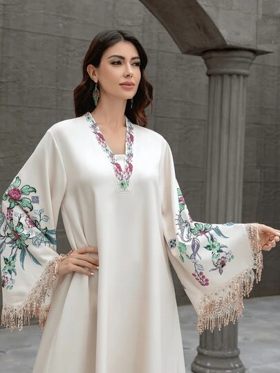 Arabic Style V-Neck Rhinestone Tassel Embellished Long Sleeve Elegant Jalabiya Robe - Apricot - View 1