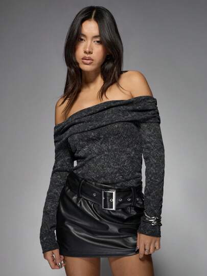 MISSGUIDED Asylum Bardot Long Sleeve Top - Dark Grey - View 1