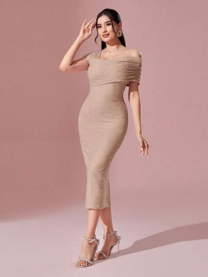 Modelyn Asymmetrical Neck Ruched Side Bodycon Dress - Apricot - View 1