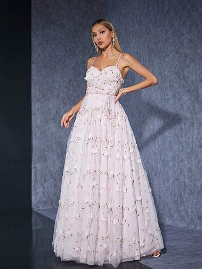 Asymmetrical Ruched Embroidered Mesh Bridesmaid Dress With Spaghetti Straps And Flared Hem - Pink - View 1