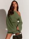 Athîral Women's Olive Green Off-Shoulder Mini Dress | Silky Soft Stretch Knit Fabric, Relaxed Flowing Draped Fit, Asymmetric Off-Shoulder Neckline, Extended Long Sleeves, Waist-Cinching Detail, Minimalist Seam Finish – Modern Sexy Style For Autumn, Winter, Spring, Party Nights, Date Night, Vacation, Urban Chic & Girls' Day Out Versatility