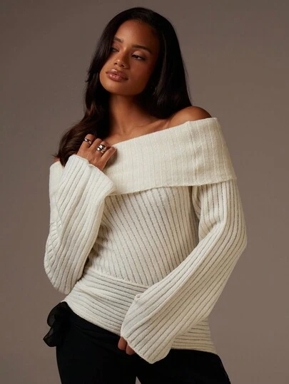 Athîral 2025 Fall New Women's Sweaters, Long Sleeve Women's Clothing, Cute Fall Clothing, Beige Tops, Off-The-Shoulder Sweaters, Christmas Sweaters - White - View 1