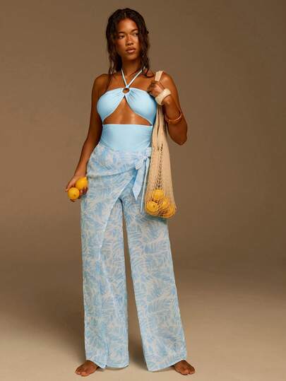 Athîral Women's Casual One-Piece Side Tie Blue Plant Pattern Pants, Made Of Soft And Comfortable Chiffon Fabric, Semi Transparent Fabric, Loose Fit, Paired With Bikini, Casual Vacation Style,Casual Outfit For Women,Casual Pant For Women,Beach Outfit,Spring Break Outfits,Spring Clothes Women,Summer Outfits,Summer Holiday Outfits,Summer Outfits For Women,Beach Pants,Blue Pants,Summer Holiday Outfits,Summer Outfits For Women,Vacation Outfits For Women - Camel - View 1