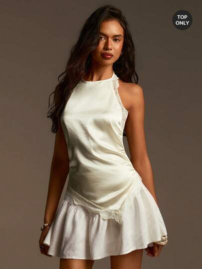 Athîral Women's Pale Yellow Lace Patchwork Halter Backless Fashion Camisole,Patchwork Lace-Trim Cami Top With An Asymmetrical Hem, Made From Soft And Comfortable Woven Fabric,Casual Women Outfits,Casual Top For Women,Summer Vacation Outfits,Summer Holiday Outfits,Vacation Outfits Women,Summer Tops,Summer Holiday Outfits , Summer Clothes ,Summer Outfits For Women,Beach Outfit,Beach Outfits For Women - Apricot - View 1