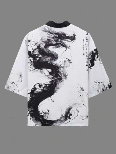 Autumn Chinese Dragon & Hanzi Print Samurai Style Loose Jacket For Men - Black and White - View 1
