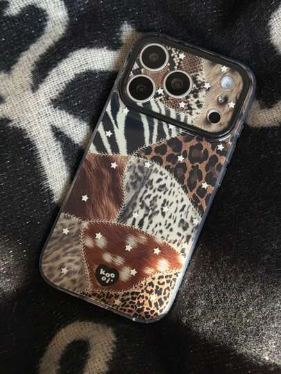 Autumn/Winter Sweet & Hot Girl Stitching Patchwork Animal Print Star Design Phone Case Compatible With IPhone 17 Pro Max, Compatible With IPhone 16 Pro, 13, 14 Pro, 15 Pro, Creative Dual-Layer Shockproof Phone Cover - Multicolor - View 1