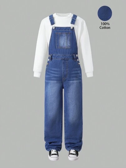 SHEIN Explorewe Tween Girls' Casual Side Button Pockets Denim Jumpsuit, Summer - Dark Wash - View 1