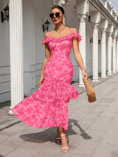 Aveloria Floral Printed Cold Shoulder Neckline Dress With Ruffle Hem And Trim Detail - Red - View 1