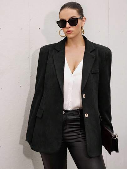 Aveloria Modichic Women's Notched Collar Double-Breasted Long Sleeve Casual Elegant OL Commuting Faux Suede Blazer - Black - View 1