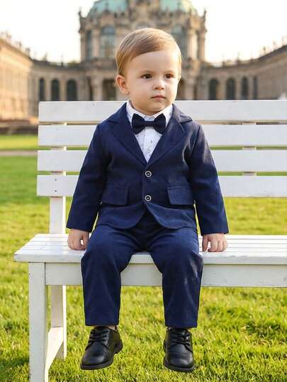 BOARNSEORL 3pcs Baby Boys Gentleman Outfit, Random Print Long Sleeve Shirt With Bowknot , Navy Blue Suit Jacket And Panttic & Fashionable For Birthday Party, Wedding, Christening, Anniversary - Navy Blue - View 1