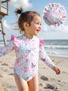 Baby Girls Beachwear,Baby Girl's One-Piece Swimsuit, Featuring A Cute Pink Cartoon Mermaid And Floral Print, Made Of Knitted Fabric. This Long-Sleeved Swimsuit Has Ruffle Details And Comes With A Matching Hat. Stylish, Casual, Exquisite, And Elegant, Perfect For Swimming, Summer Vacations, Beach Trips, Pool Parties, And Summer Holidays.