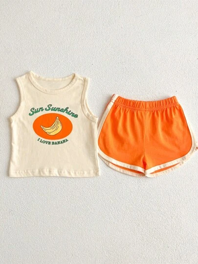 Baby Banana & Letter Graphic Tank Top & Contrast Binding Shorts - Multicolor - View 1
