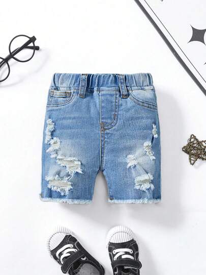 SHEIN Baby Boy Casual Soft Cute Ripped Frayed Rough Edges Denim Short,For Summer - Light Wash - View 1