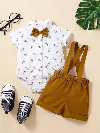 Souflis Souflis Baby Boy Dinosaur Print Bow Front Shirt Bodysuit & Pinafore Shorts - Multicolor - View 1