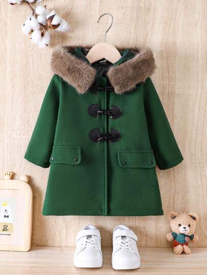 Baby Boy Fuzzy Trim Hooded Duffle Button Front Overcoat - Army Green - View 1