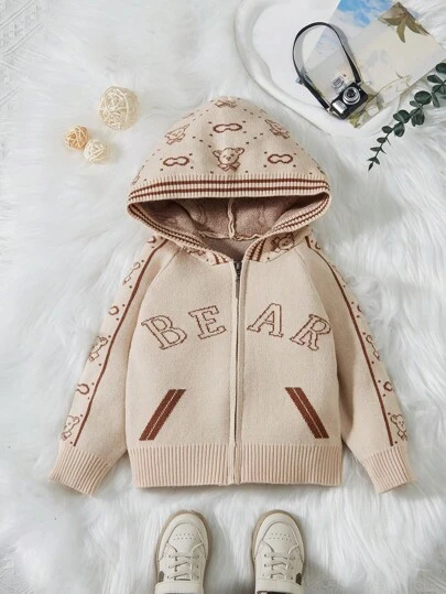 Baby Boy Letter & Bear Pattern Raglan Sleeve Hooded Cardigan - Khaki - View 1