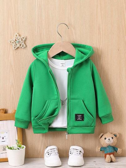 Baby Boy Letter Patched Detail Zip Up Hooded Jacket Without Tee - Green - View 1