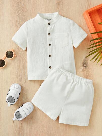 Baby Boy Patch Pocket Shirt And Shorts Casual Set, Suitable For Summer Outfits - White - View 1