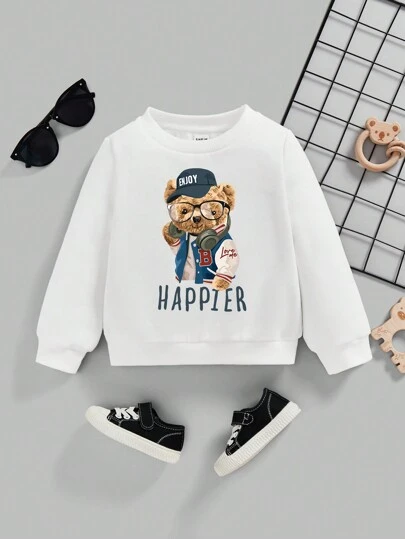 Baby Boy Bear & Letter Print Casual Sweatshirt, Cute & Minimalist Design, Suitable For Autumn/Winter - White - View 1