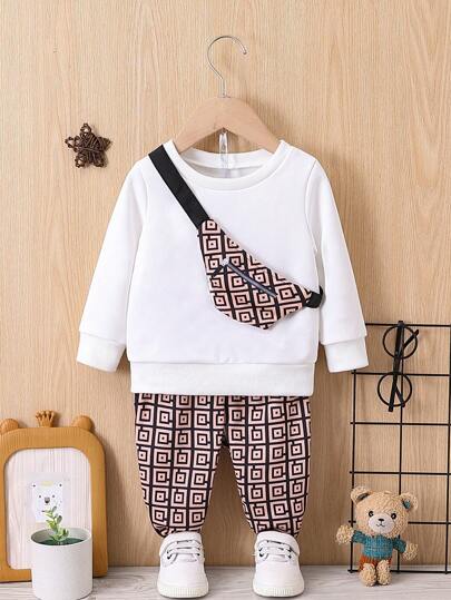 Baby Boys' Round Neck Long Sleeve Sweatshirt And Geometric Printed Pants With Bag Set - Brown - View 1