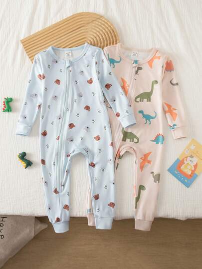 Baby Boys Snug Fit Pajamas-Dino Bear Print Round Neck Long Sleeve Full Length Zipper Pajamas Pastel Blue Beige Holiday 2026 New Year Party Essential Breathable Stretchy Soft All Season - Multicolor - View 1