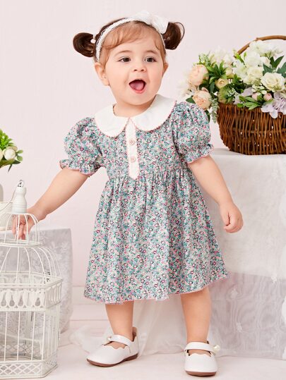 SHEIN Baby Girl Ditsy Floral Print Peter Pan Collar Puff Sleeve Dress - Multicolor - View 1