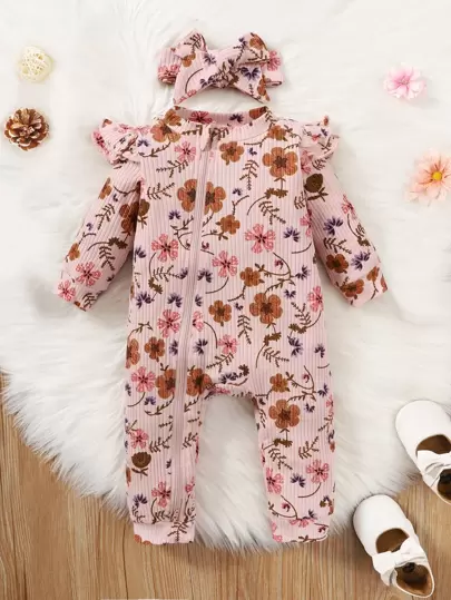 Baby Floral Print Ruffle Trim Jumpsuit & Headband - Dusty Pink - View 1