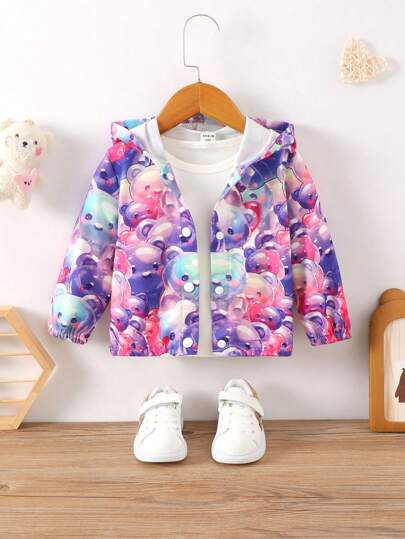 Baby Girl 1pc Bear Print Zip Up Hooded Jacket - Purple - View 1