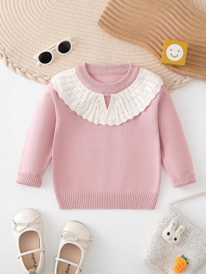 Baby Girl Contrast Foldover Collar Sweater - Pink - View 1