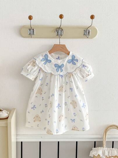 Baby Girl Cute Bear, Bow And Floral Print Ruffle Hem Dress - Blue - View 1