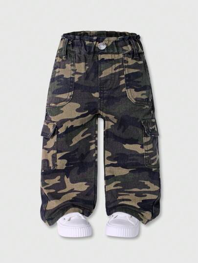 Baby Girl Cute Flower & Camouflage Pattern Multi-Pocket Denim Jeans - Multicolor - View 1