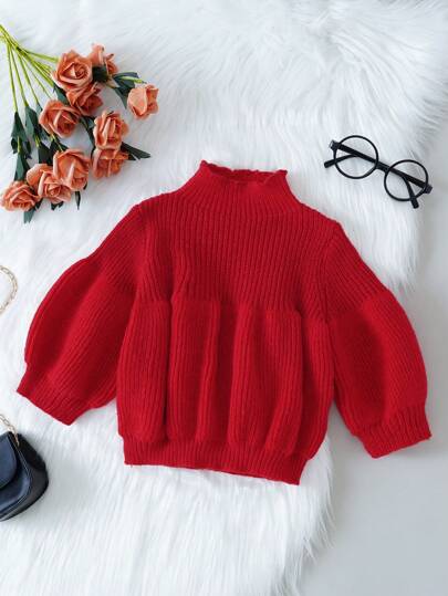 Baby Girl Mock Neck Lantern Sleeve Sweater - Red - View 1