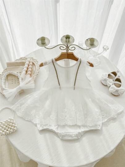 Baby Girl White Lace Spliced Waist Cinched Bodysuit - White - View 1
