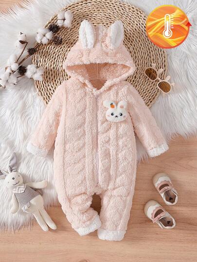 Baby Girls' Hooded 3D Ears Cute Rabbit Fluffy Warm Jumpsuit, Winter - Apricot - View 1