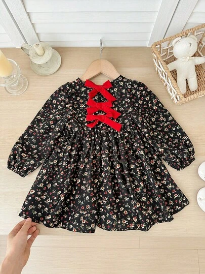 SHEIN Baby Girls Cute Vacation Casual Apricot Floral Pattern Bowknot Long Sleeve Loose Dress - Black - View 1