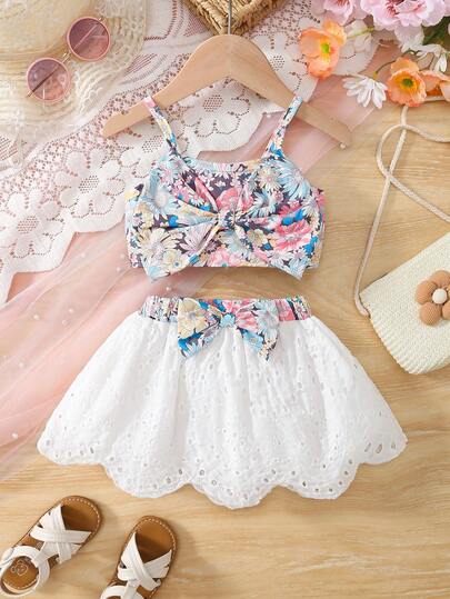Baby Girls Floral Print Ruffle Strap Top + Butterfly Decor Ruffle Hem Skirt Set - Multicolor - View 8