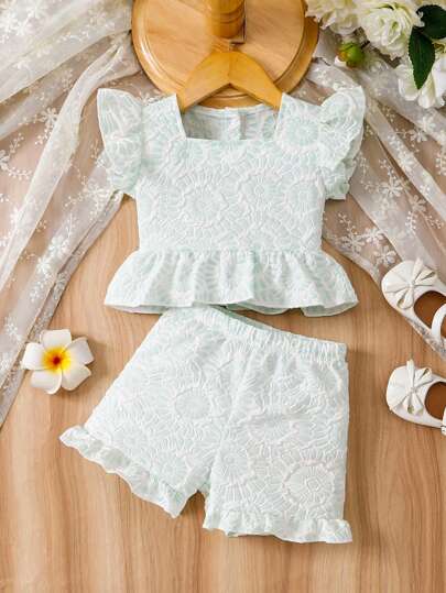 2pcs Baby Girls Floral Print Ruffle Collar Puff Sleeve Top And Shorts Set, Suitable For Spring/Summer Outdoor - Green - View 8