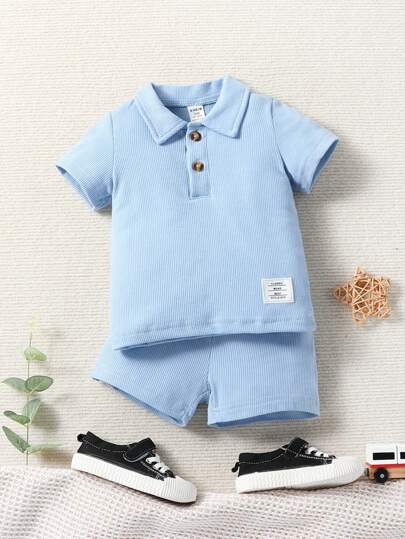 Baby Letter Patched Detail Polo Shirt & Shorts - Baby Blue - View 1