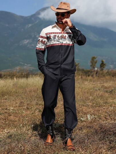 Manfinity Nomadique Men's Western Cowboy Casual Vacation Wild Horse Print Black Khaki Color Block Long Sleeve Shirt & Pants Suit, Men Clothes, Long Sleeve Men Button Up Vintage Shirts & Pants, Men Two Pieces Outfits - Multicolor - View 1