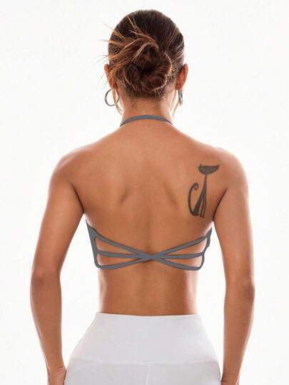 Easithlete Grey Halter Sports Bra With Criss Cross Back Design For Women Open Back Sports Bra Workout Top Open Back Open Back Gym Tops Workout Tops Backless Backless Workout Bra - Grey - View 6
