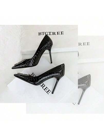 Banquet High Heels, Stone-Patterned Patent Leather Shallow-Mouthed Pointed Rhinestone Buckle High Heels Shoes - Black - View 1