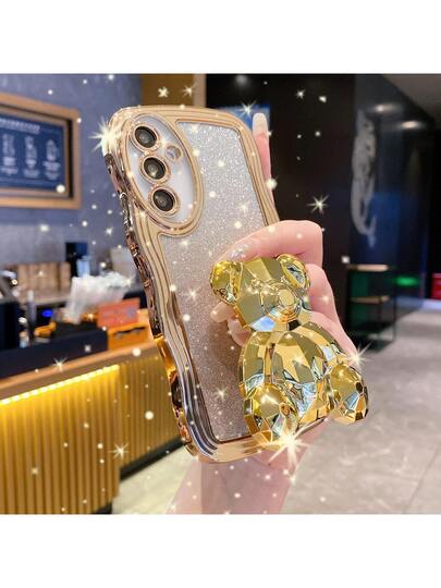 Bear Luxury Electroplated Phone Case With Wave Pattern, Shock-Proof, Dust-Proof, Thick Edges, Compatible With IPhone 17 Pro Max, Galaxy S24 Ultra/S24 Plus/S24, S23 Ultra/S23 Plus/S23, S22 Ultra/S22 Plus/S22, S21 Ultra/S21 Plus/S21 FE, S20 Ultra/S20 Plus/S20 FE, OPPO A5x/C1 2 3 4 5 6 7 8 9, OPPO 9 8 7 6 5 4 3 2 1 - Gold - View 1