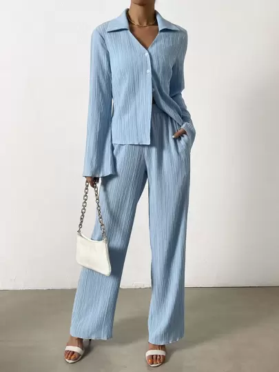Chiquease Bell Sleeve Plisse Shirt & Wide Leg Pants - Baby Blue - View 1
